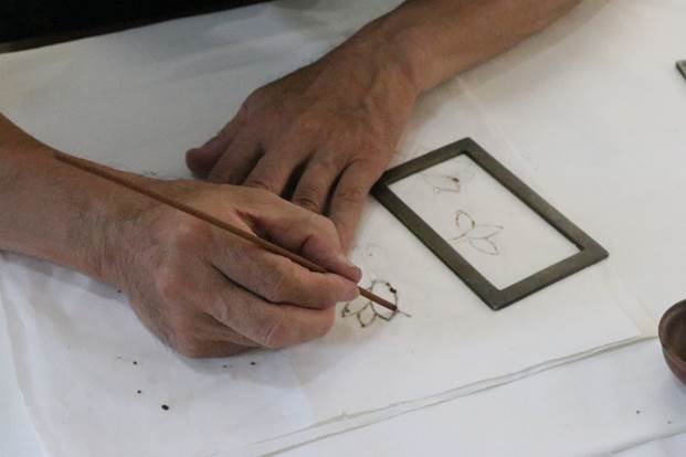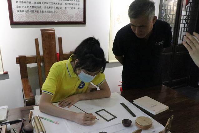 逐梦青“舟”实践队拜访了“焚香烙画”大师——杨祖乾,走进杨老师的传习所,团队成员看到的是用点燃的香烛在薄如蝉翼的宣纸上复制的《清明上河图》、《麻姑献寿》等画作,完成后的“焚香烙画”人物线条流畅,表情丰富细腻,形象栩栩如生,书法也是苍劲有力,有强烈的视觉冲击力。除了完成的“焚香烙画”作品让我们感到惊艳,更令我们动容的,还是这“焚香烙画”背后失而复得的艰辛故事。“焚香烙画”是杨家祖学家传,却在“文革”时期被禁止,技艺在其间未有突破甚至一度失传,直到改革开放、文化大复兴,“焚香烙画”才迎来了新的生机。后来,团队成员在杨老师的指导下,亲身体验“焚香烙画”的过程,在互动中团队成员感受到了手工技艺的独特魅力。