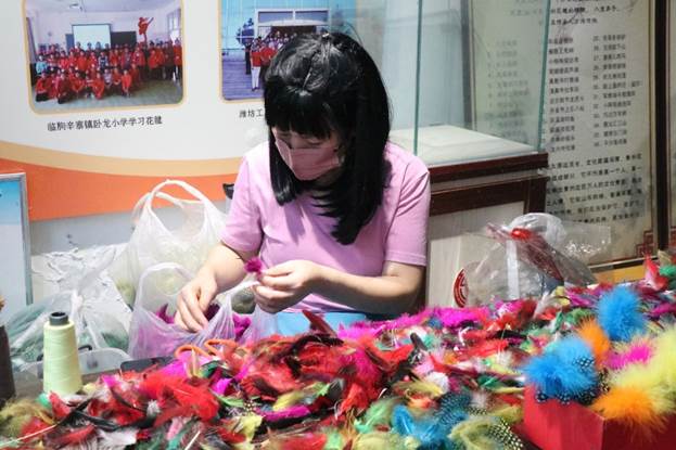脚尖飞羽,灵动千年。走进花键传习所,花键传承人李红老师正在用鸡毛编织着丰富多彩的花键,从李红老师口中得出,青州花键作为“蹴鞠”的演变品,至今已有两千多年的历史,共有108种花样,对于研究古代舞蹈、体育和竞技有着较高的历史价值,青州花键也正在一代一代传承下去。团队成员拿起花键进行体验,在竞技中,团队成员明白花键在制作技艺与踢弄技艺两个方面都要有丰厚的积累。